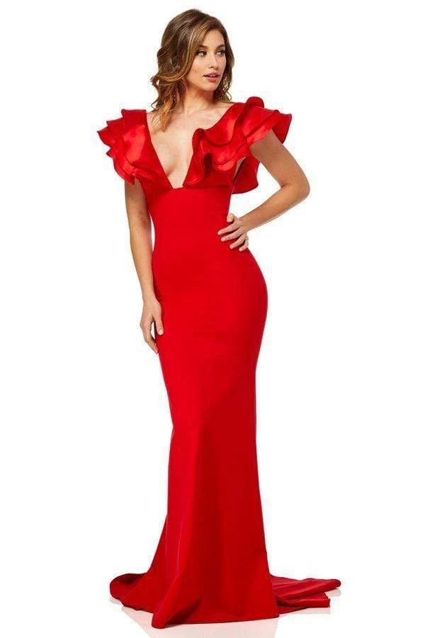 Stand out in every occasion with this daring creation by Sherri Hill 52550. Presents a ruffled, deep V-neckline with fitted bodice styled with a back zipper closure. The skirt fits at the thighs and flares at the bottom to a sweep train finish. Wow everyone in this sophisticated dress by Sherri Hill.