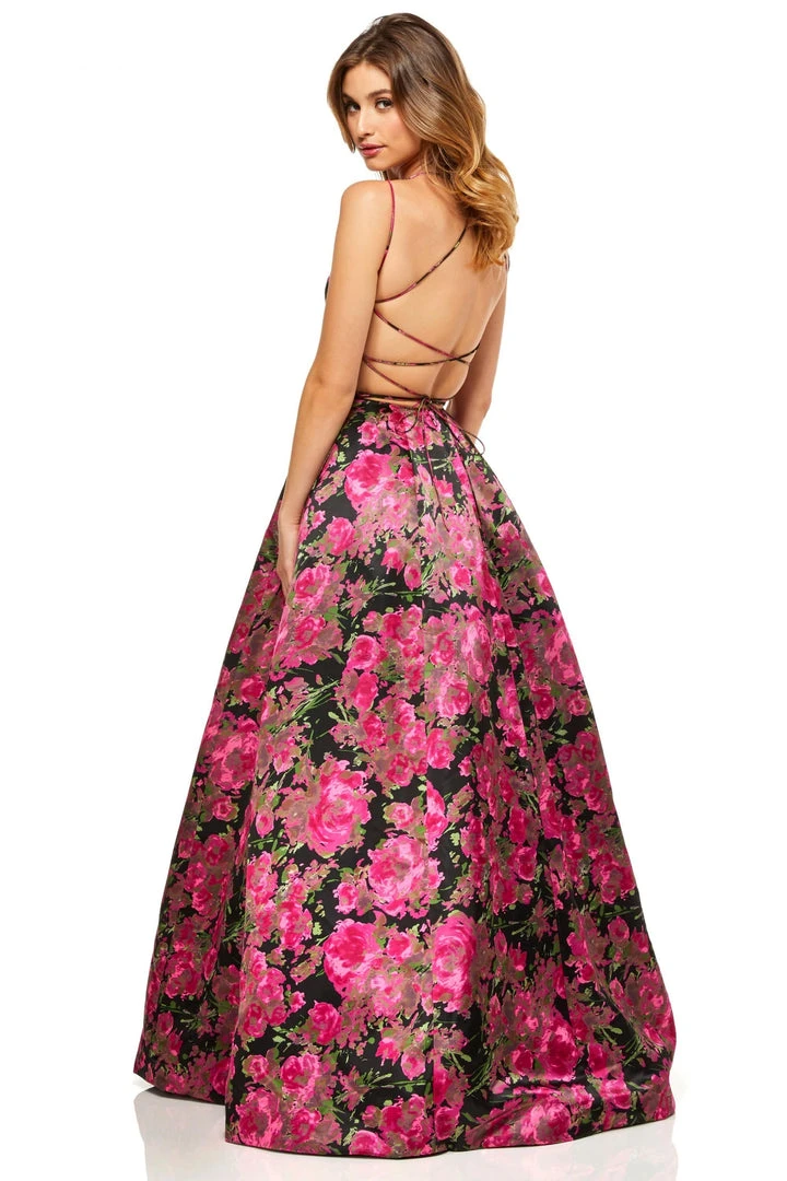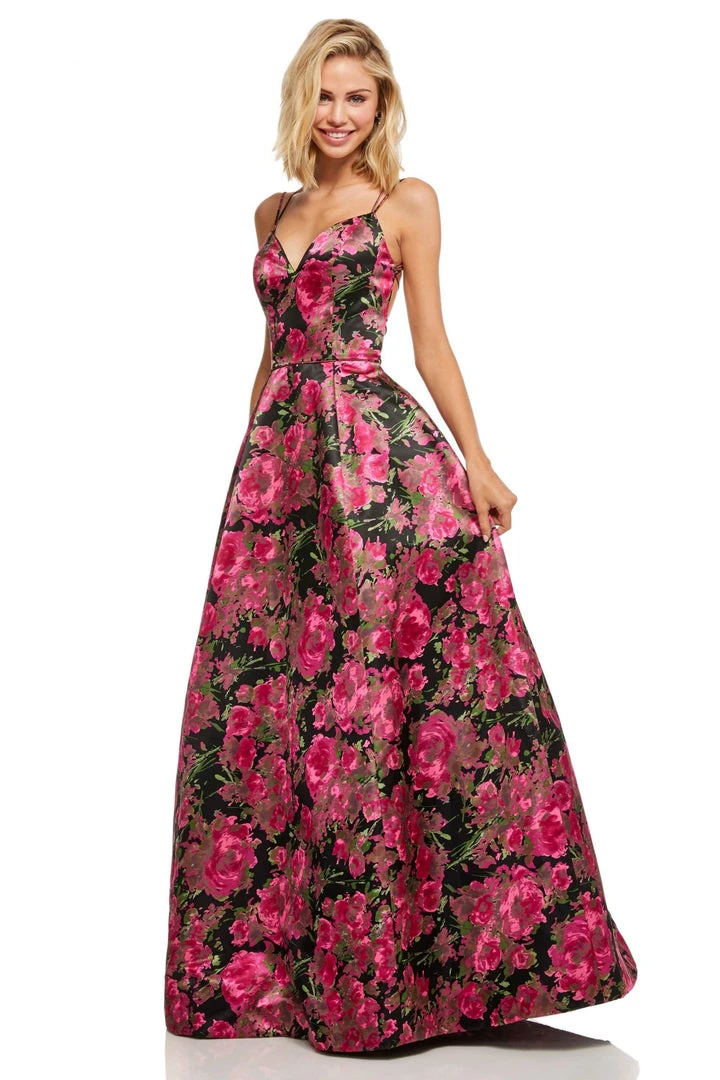 Bloom with loveliness in this floral gown from Sherri Hill 52627. This elegant floral dress showcases a sweetheart neckline on a fit-and-flare type of gown. It is a long A-line silhouette dress that is styled with a sexy lace-up open back design. Radiate a fresh style as you orchestrate a dramatic entrance in this radiant Sherri Hill creation. Model is wearing Black Print color.