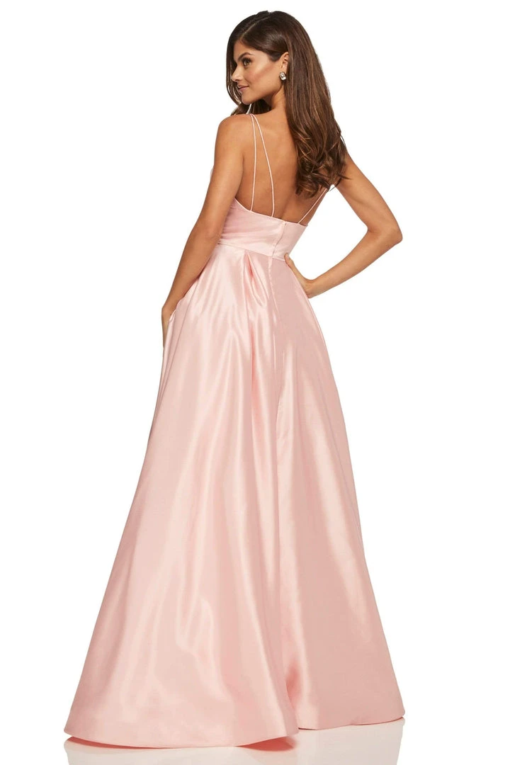Elegance with a touch of sparkle perfectly describes this beautiful ballgown by Sherri Hill 52629. This shimmering satin gown boasts a trimmed, fitted midriff that defines the V-neckline, held by spaghetti shoulder straps, leading to the mid-open back. Featured with beaded bow accent on the pockets, this luxurious full-length gown creates a ballgown silhouette with an added sparkle. Get that glamorous look with this creation by Sherri Hill that is perfect for any formal, black tie and white tie occasions.
