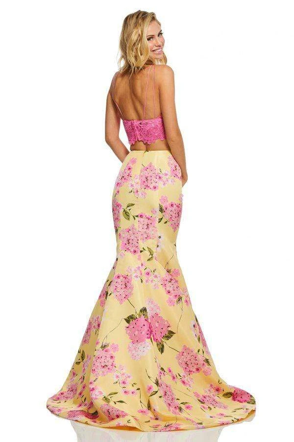 This enchanting dress by Sherri Hill 52635 is sure to make you the center of everyones attention. This two piece dress is designed with a sleeveless, plunging V-neckline lace crop top. The floral print skirt forms a mermaid silhouette and is detailed with a high slit and a sweep train finish. Look fantastic for your next formal event in this evening gown by Sherri Hill.