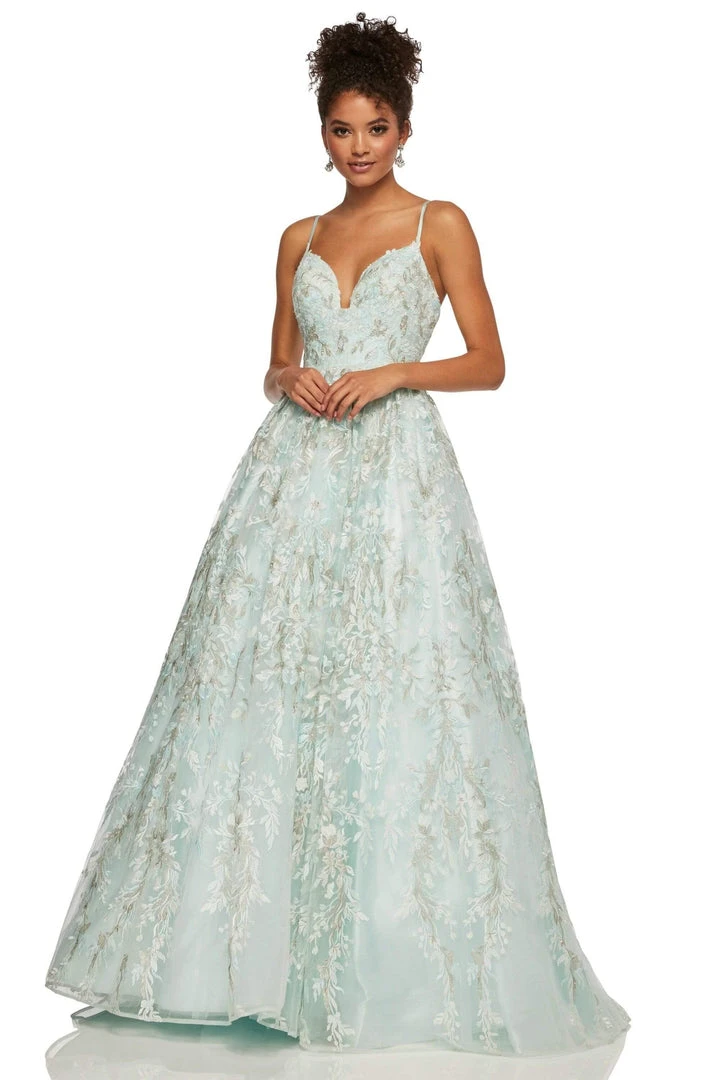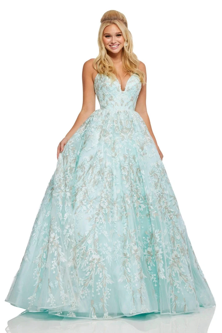 You are a picture of perfection in a defined gown from Sherri Hill 52759. This extravagant dress is fully adorned with lace appliques and metallic beading and features a fitted bodice with a sweetheart neckline and lace up tie back. The full, long ball gown skirt is festooned as well and finishes with a back sweep train. With a little glam and a lot of class, this evening gown by Sherri Hill is an evening event winner. Find more prom dresses!