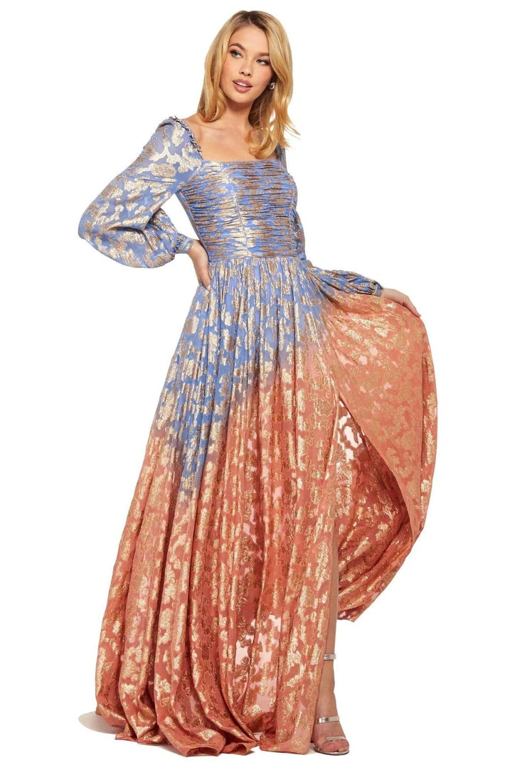 Wow everyone in this sophisticated Sherri Hill 53349 masterpiece. This boho chic inspired evening dress is crafted in a contrasting color print fabric with gold metallic threads. This beautiful dress showcases a ruched bodice with long blouson sleeves with ruffle detail at the shoulders, a squared off neckline and open lace up tie back. The a-line long skirt flows attractively with a side front slit. This Sherri Hill dress definitely parades the elegant and classy style. Model is wearing Periwinkle/Coral color.