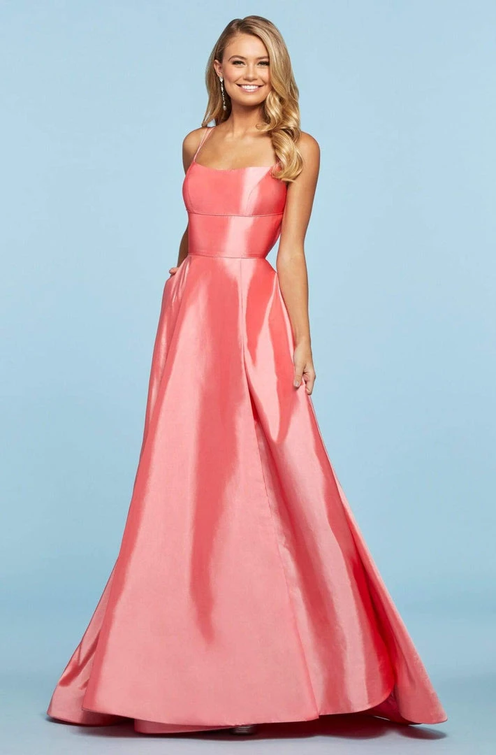 Fall in love with the timeless and utterly chic Sherri Hill 53531 creation. Contoured with seams in a luminous taffeta fabric, this beauty shows a straight-across neckline trailing from spaghetti straps. Lace up details into a tie design on an open back, the sleek skirt reveals a crossover front slit as it flows into a sweep of train. Make a statement as you inspire awe in this Sherri Hill masterpiece. Models are wearing the Aqua and Coral colors.