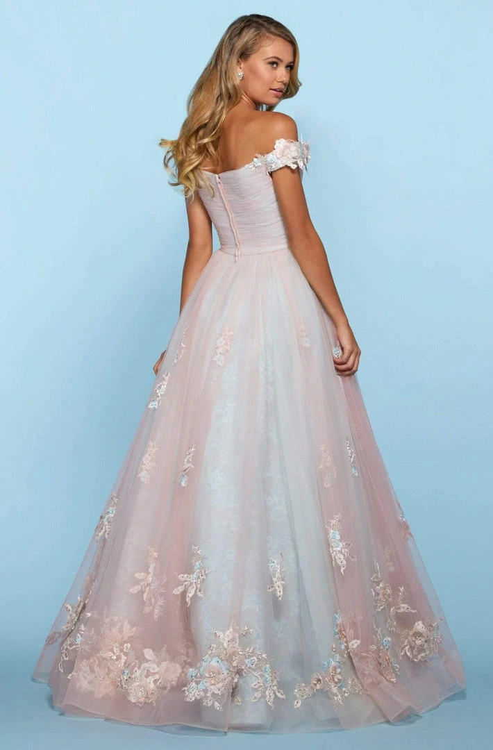 Be the delight of everyone’s eyes in Sherri Hill 53587. Featuring an off-shoulder with sweetheart notch neckline, this masterpiece comes floral appliques all over, ruched bodice details, mid-open back, and a zipper closure. The ballgown silhouette skirt is adorned with tulle detailing and horsehair hemline. You are princess for an evening in this beautiful design. Model is wearing ivory/pink.