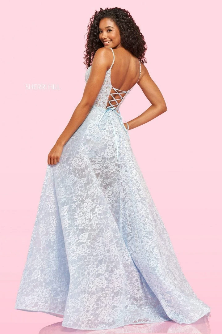 Step on the red carpet with style in this Sherri Hill 54193 creation. Intricately embellished with beads and floral appliques, this dress reveals a corset bodice with a v-neckline and spaghetti straps. The back is cinched with a lace up design. The skirt flares and cascades into a luxurious train. Look like a modern princess in this Sherri Hill masterpiece. Model is wearing the Light Blue color.