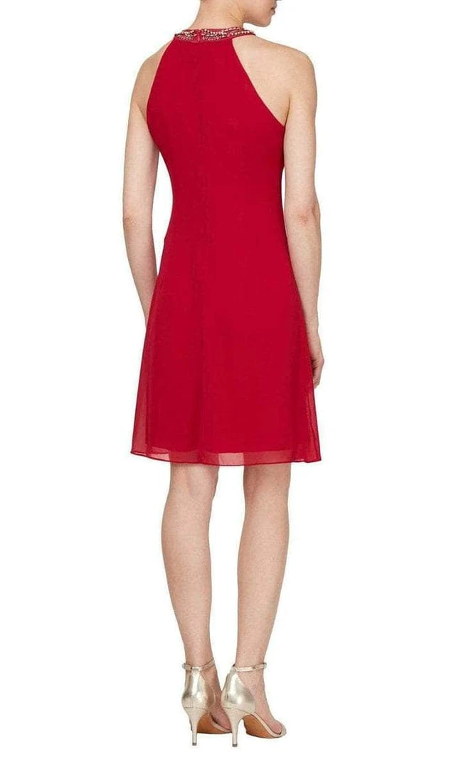 Designed with soft pleats weaving the a beaded collar, this piece fascinates with a halter neckline with a racerback. Accented with a ruffled cascade, the A-line skirt flares into a knee length hemline.Â