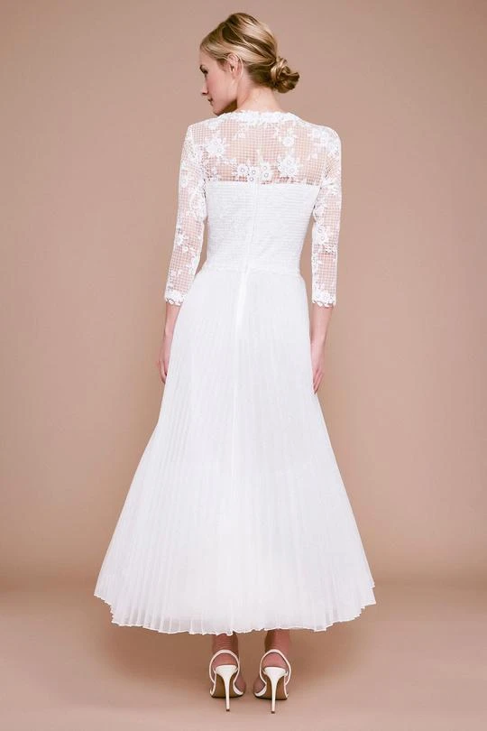 This wedding dress enjoys a lightness and delicacy thanks to a fitted bodice with lace overlay and a full, micro-pleated tulle skirt, while the style’s tea-length hemline and cinched waist evoke the timeless glamour of Hollywood’s Golden age. Center back invisible zipper.
