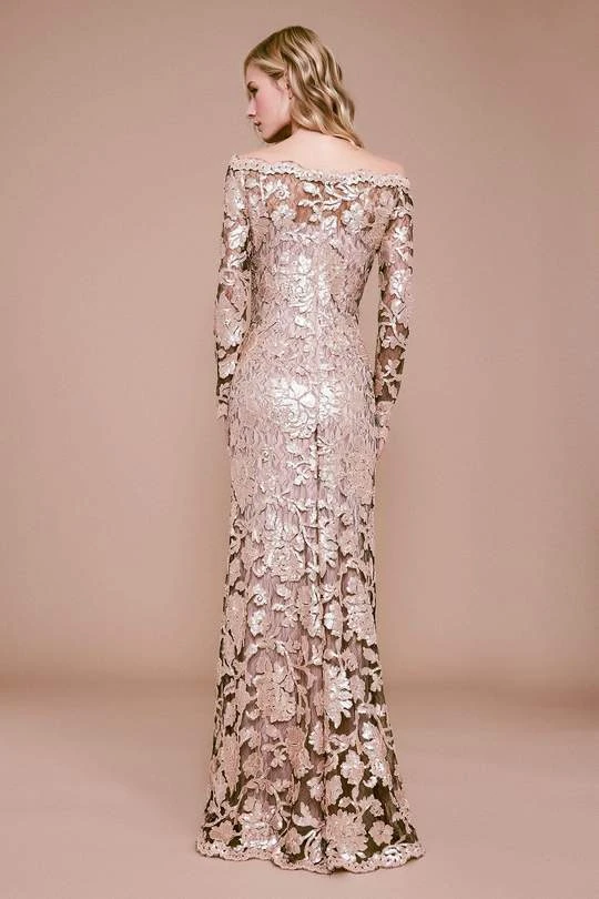 Stunningly designed in matte-metallic paillette embellishments, this dress features a fitted bodice framed with an off-shoulder neckline over a distinct sweetheart lining and long sleeves. This dress presents a sheath silhouette that cascades to a full length hemline, finished with scalloped edges and eyelash trims as the mid-open back is secured with a center zipper closure.
