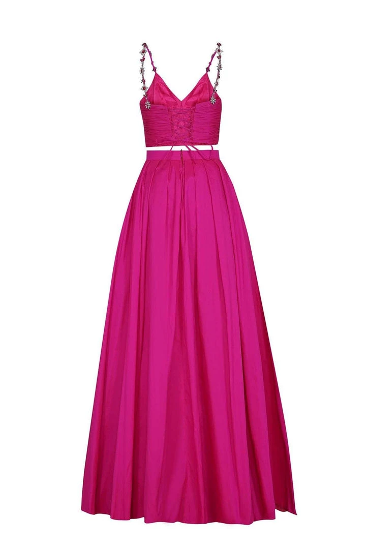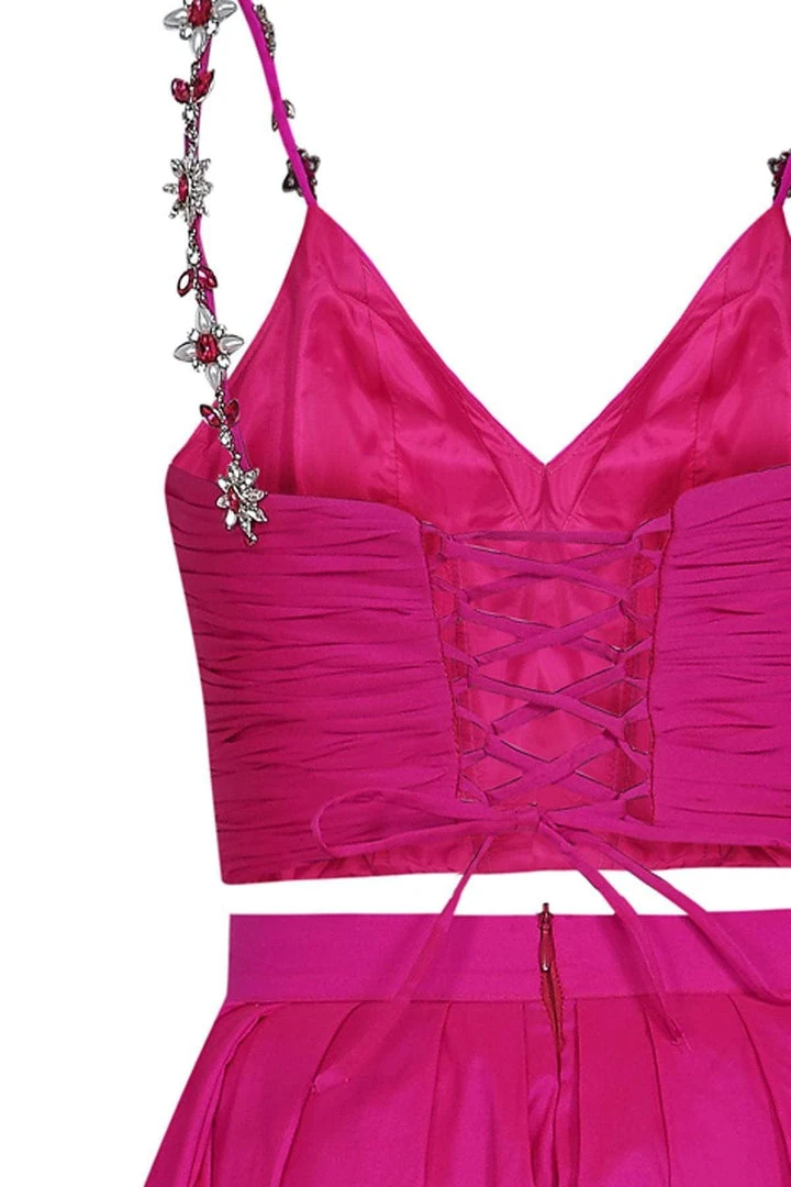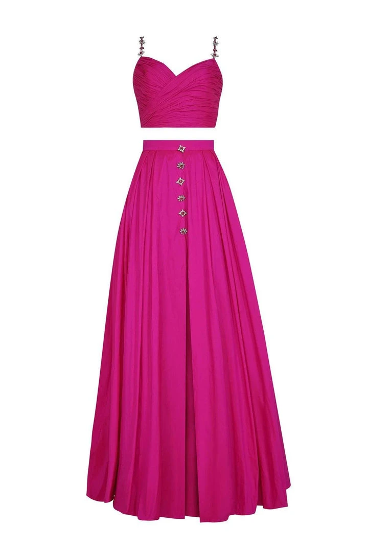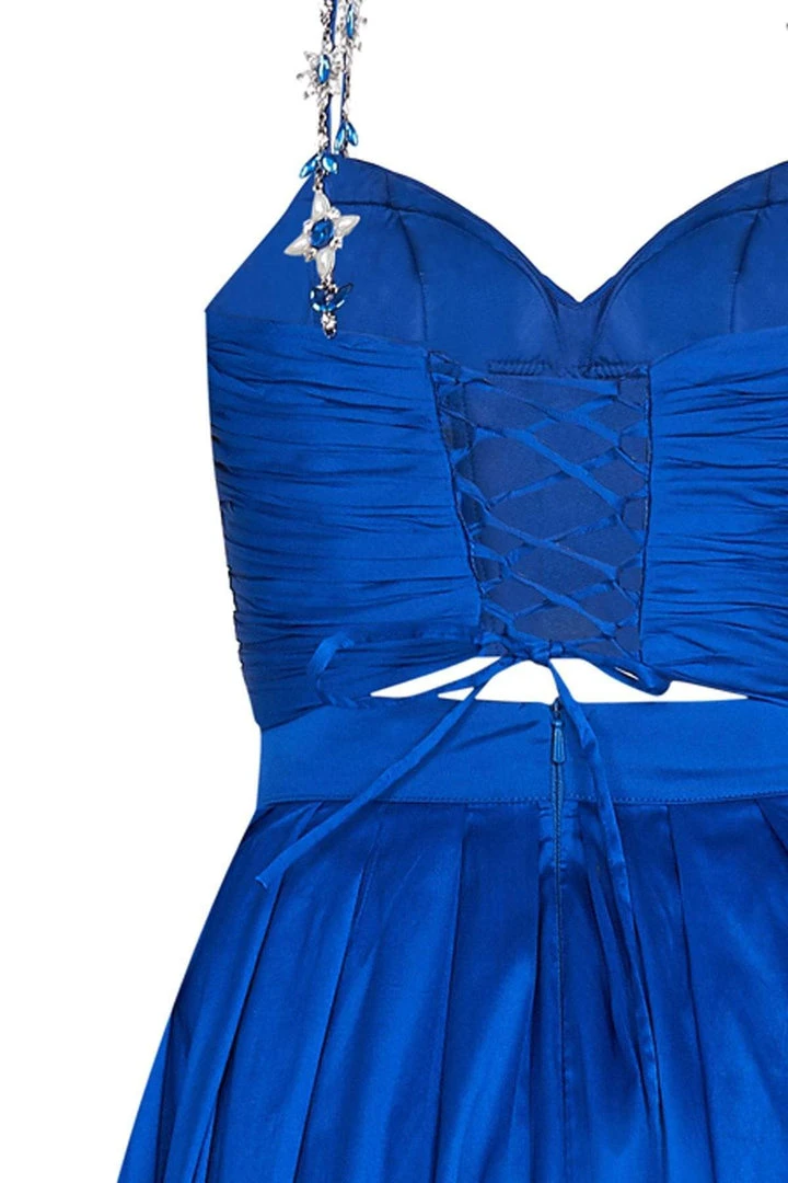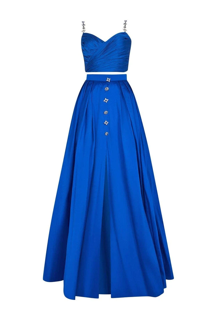 | Details: | Taffeta, Two-Piece, Jeweled Spaghetti Straps, Shirred Bodice, Lace Up Back, Back Zipper Closure, Slender Waistband, Brooch Ornate High Slit, Pleated Skirt, Sweep Train |