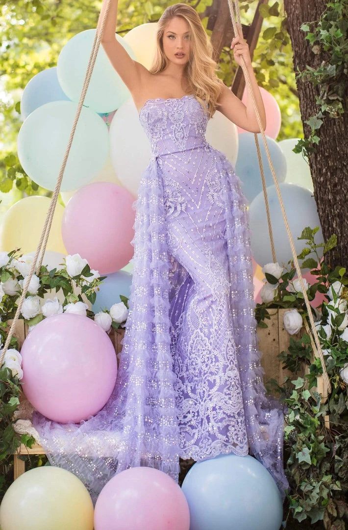 | Details: | Embrodery Fabric, Sequins, Beads, Patterned applique, Strapless, Fit and flare, Detachable overskirt, Ruffle accent, Sweep train |
