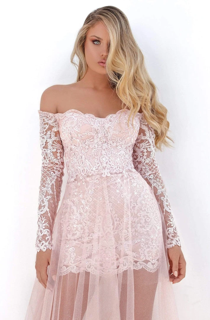 Amp up the chic factor in this Tarik Ediz 50668 creation. Featuring a fitted bodice with an overlaying sequin-ornate embroidered details, this gown is fashioned with an off shoulder neckline coupled with a mid-open back. Framed with long sleeves that shows a sheer rendering, a fitted mini-skirt is overlaid with a gossamer drape that falls into a train. Entrance everyone with the sheer perfection of this Tarik Ediz masterpiece. Model is wearing the Pink color.