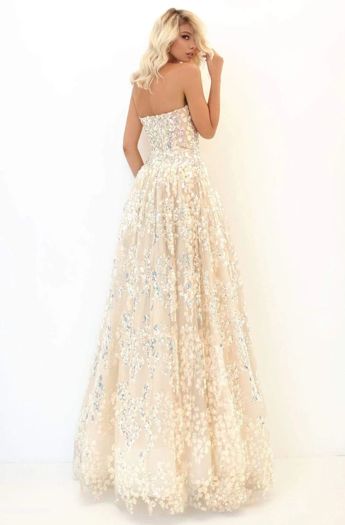 Flaunts class and beauty in this iridescently embellished Tarik Ediz 50730 creation. Adorned with glimmering sequins in texturing its entire length, this beauty flaunts a strapless straight-across neckline coupled with a mid-open back. The glimmering A-line skirt flows down to the floor length from your fitted waist. Garb yourself in pure opulence in this Tarik Ediz masterpiece. Model is wearing the Ivory color.