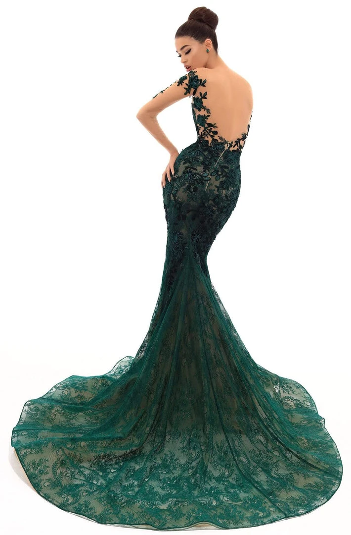 Get that glamorous look with this formal dress from Tarik Ediz 93669. Features an illusion bateau neckline with sheer long sleeves adorned with sequins and floral appliques extending to the plunging neckline and fitted bodice. The back flaunts a low V-back and shows a back zipper closure. The lace mermaid skirt finishes in a dramatic sweep train. Turn heads in this daring yet fabulous Tarik Ediz dress.