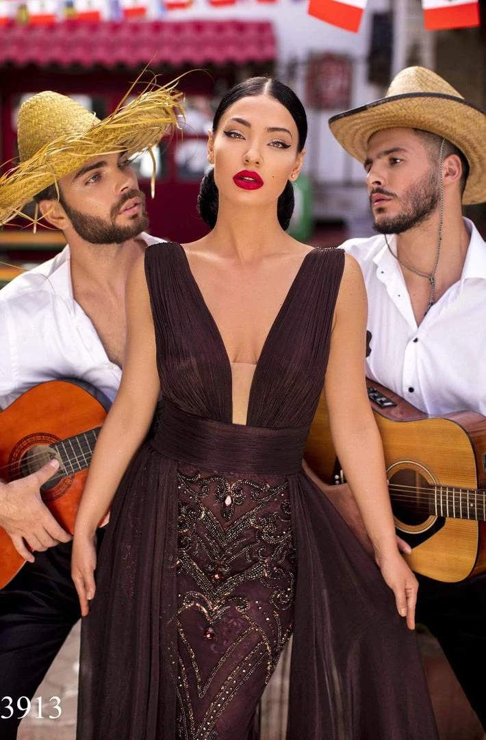Look totally amazing at your upcoming social event with this wonderful Tarik Ediz 93913 masterpiece. A plunging V neckline with sheer inset detail at the bust bisects the sleeveless bodice, complemented with an open back. Ruching details design the bodice and wide band as it gives way to the intricately beaded full length sheath skirt. Adding elegance to the whole ensemble is the chiffon overskirt which dramatically finishes with a cathedral train. Have all eyes on you with this Tarik Ediz creation. Model is wearing Brown color.