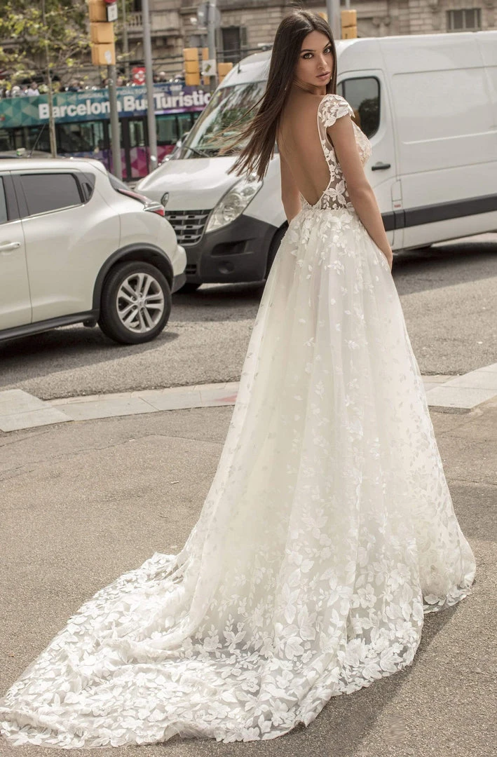 | Details: | Tulle, Plunging V-Neckline, Cap Sleeves, Sheer Bodice, Floral Appliques, Open Back, Zipper Closure, A-Line Silhouette, Chapel Train |