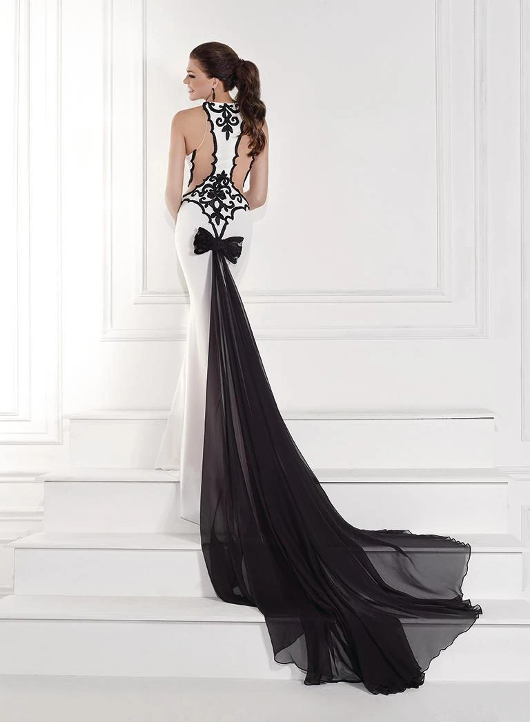 Take their breath away with this stunning evening dress by Tarik Ediz 92566. This charming evening gown showcases a halter neckline. Complementary exceptional embroidery embellishes the neckline and along the back, with the sheer cutout detailing panels the sides. The curve hugging fit is highlighted with a contrasting large bow detailing at the back and cropped with a widespread sweep train that floats down into the floor. This Tarik Ediz is sure to make you the darling of the party! Model is wearing a Black/White color.