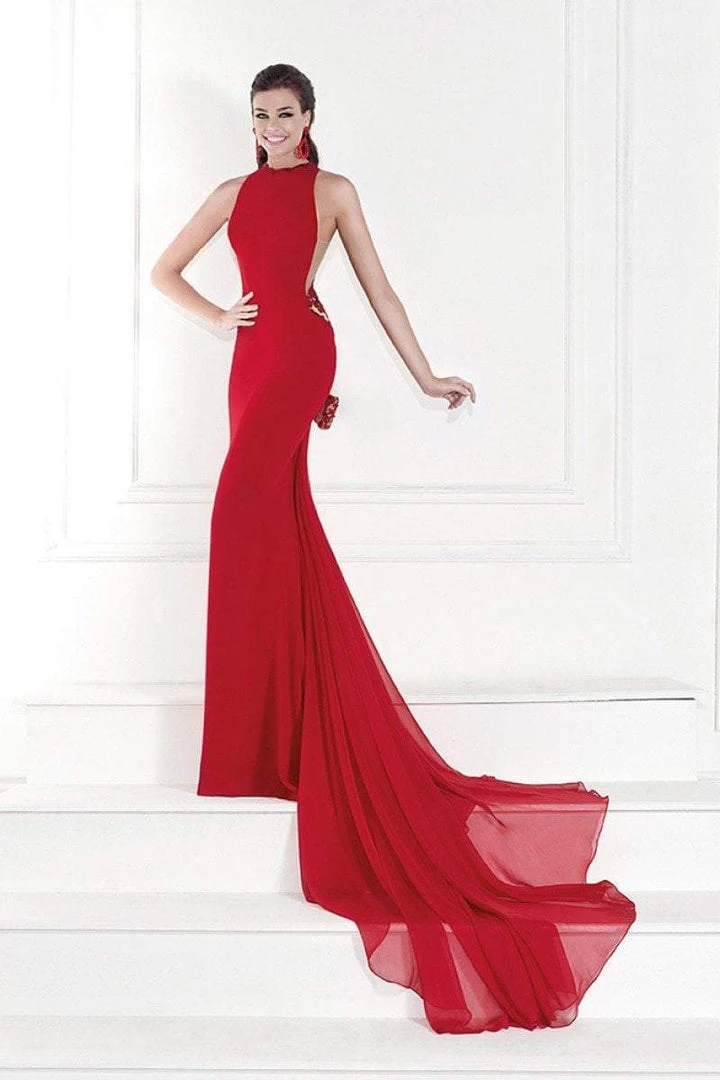 Wow everyones this sophisticated gown by Tarik Ediz 92528. This creation features a halter neckline. Color-matching beads adorn the nude fabric that covers the back. The full-length slim skirt will showcase your greatest figure. A huge bow detailing highlights the back, leading the sweep train that gives royal flow as you walk into the carpet. Be in this gorgeous Tarik Ediz creation and leave a lasting impression. Model is wearing Red color.