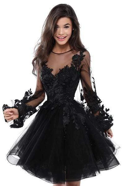 Charms in an illusion jewel neckline with sheer long sleeves. The bodice and sleeves are decorated with floral lace appliques. From the waist begins a mid-thigh A-line skirt with a horsehair hemline. Model is wearing Black color.