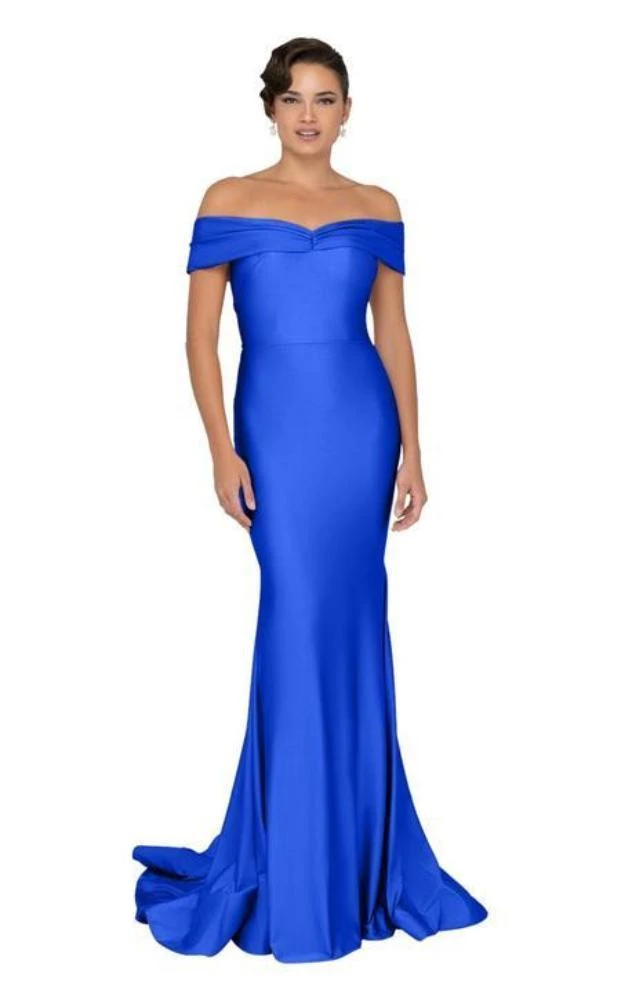 Indulge in appreciative glances when you flaunt your spectacular decadent style in this stunning evening gown by Terani Couture 1912P8283. This classy ensemble is crafted in solid spandex satin, features an off shoulder neckline and flawless form fitting bodice and a full length mermaid silhouette skirt that finishes with a dramatic train. Breathe verve and sophistication into your fabulous event in this fascinating Terani Couture masterpiece.