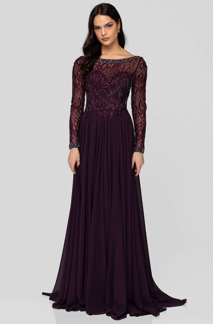 Exhibit your softer side in this delightful evening gown by Terani Couture 1913M9419. Dazzles in a bateau neckline with sheer long sleeves. The sweetheart lined bodice is decked with glittering embellishments. The dress has a V-back and a flowy A-line skirt that runs at full length hem. Waltz into the party and feel like a queen in this Terani Couture design.