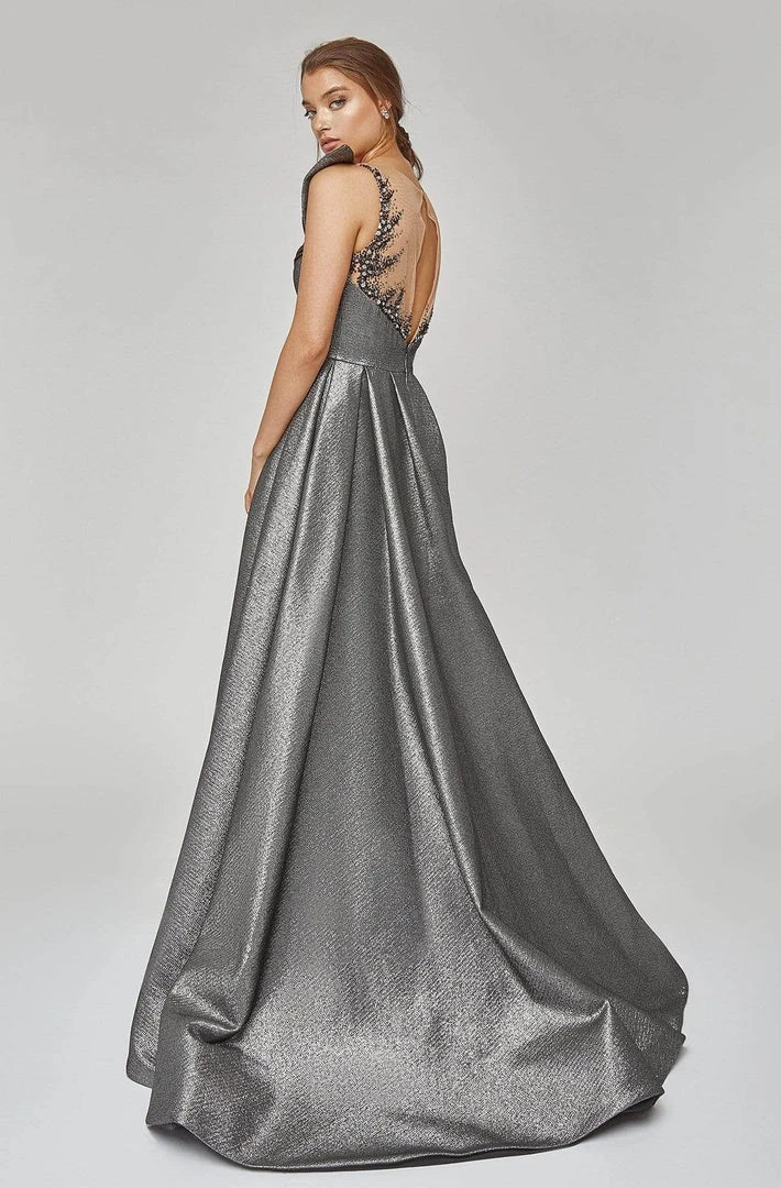 Pleases in a sleeveless, illusion bateau neckline with bodice styled with embellishments. The gown is styled with a back keyhole. The skirt flourishes in a full length pleated A-line skirt. Model is wearing Gunmetal color.