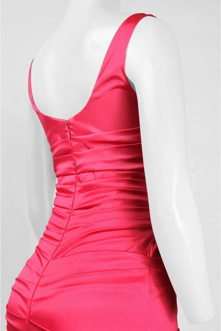 Be a woman of style and beauty in this classy evening dress from Theia 881195. The cowl neckline and thick straps accent the slim fitting bodice. Ruched starting at the empire waist, this body conscious style is sexy and sophisticated. The long asymmetrical skirt drapes elegantly to the floor. Chic and refined, this stunning masterpiece from Theia is a wardrobe staple. Model is wearing Midnight color.