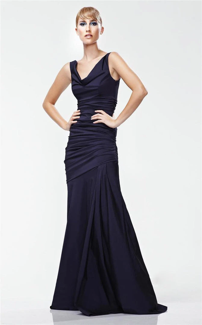 | Details: | Asymmetric, Cowl neck, Sleeveless, Pleated, Scoop back, Mermaid taffeta, Back zip closure |