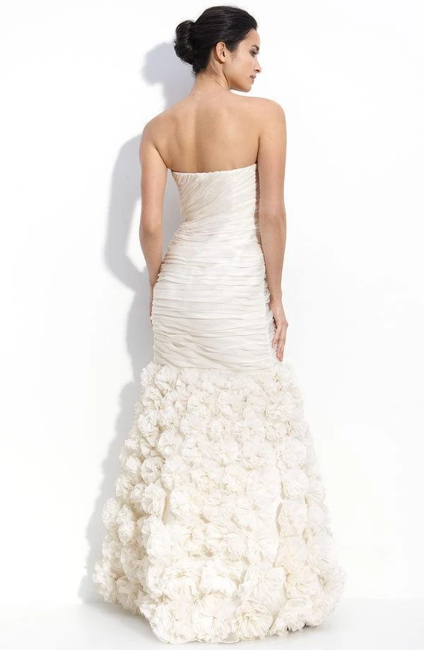 Glide on the red carpet like an ethereal goddess in this lavishly ornate Theia 890092 creation. Showing gentle spliced ruching, this exceptional piece presents a strapless sweetheart neckline and a mid-open back lined with fabric covered buttons. Sculpted from the waist down to the mid-thighs, the trumpet skirt displays rosette organza flaring down at a full-length hem. Exude romance and exquisite taste in this Theia masterpiece. Model is wearing the Off-White color.